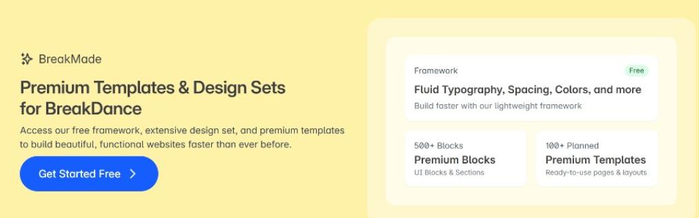 Улучшите свой рабочий процесс Breakdance с помощью шаблонов и блоков BreakMade. Ускорьте свой рабочий процесс, запускайте веб-сайты в два раза быстрее и впечатляйте клиентов исключительными результатами.