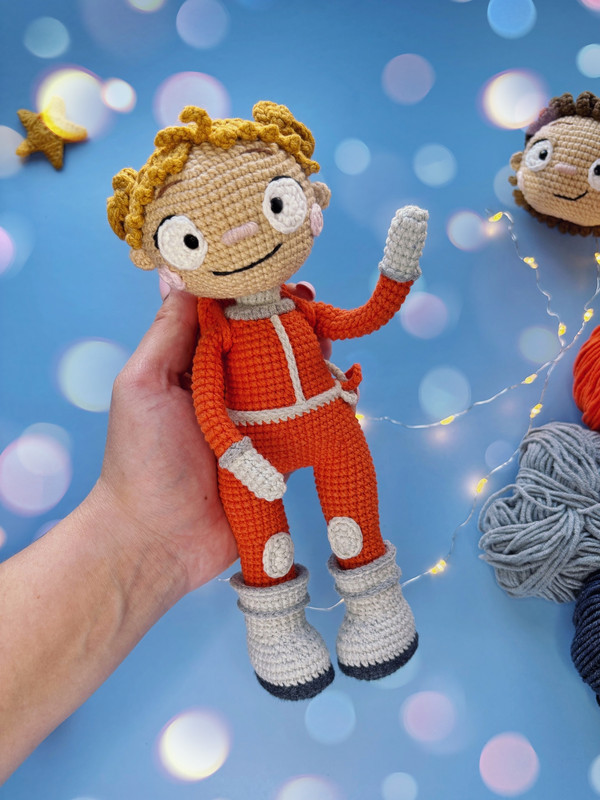 Игрушка вяжется одной деталью, рост - 27 см. Расход пряжи - около 2 моточков основного цвета и половина моточка на одежду.