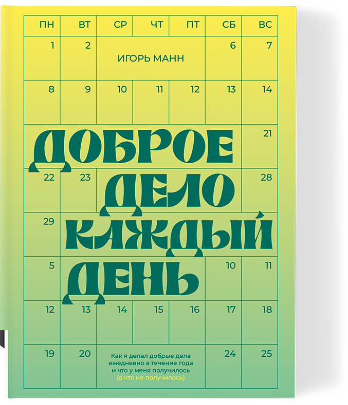 Эта книга - искренний и практичный дневник годового эксперимента Игоря Манна «Год добрых дел», в котором он поставил себе цель делать минимум одно бескорыстное дело каждый день. Вы узнаете, как автору удалось не сломаться и пройти этот путь до конца, и, возможно, захотите повторить его опыт. Это книга о том, как сделать мир вокруг себя лучше, тренируя память, силу воли, а также как вдохновлять на добрые поступки окружающих: от членов семьи до целых компаний.