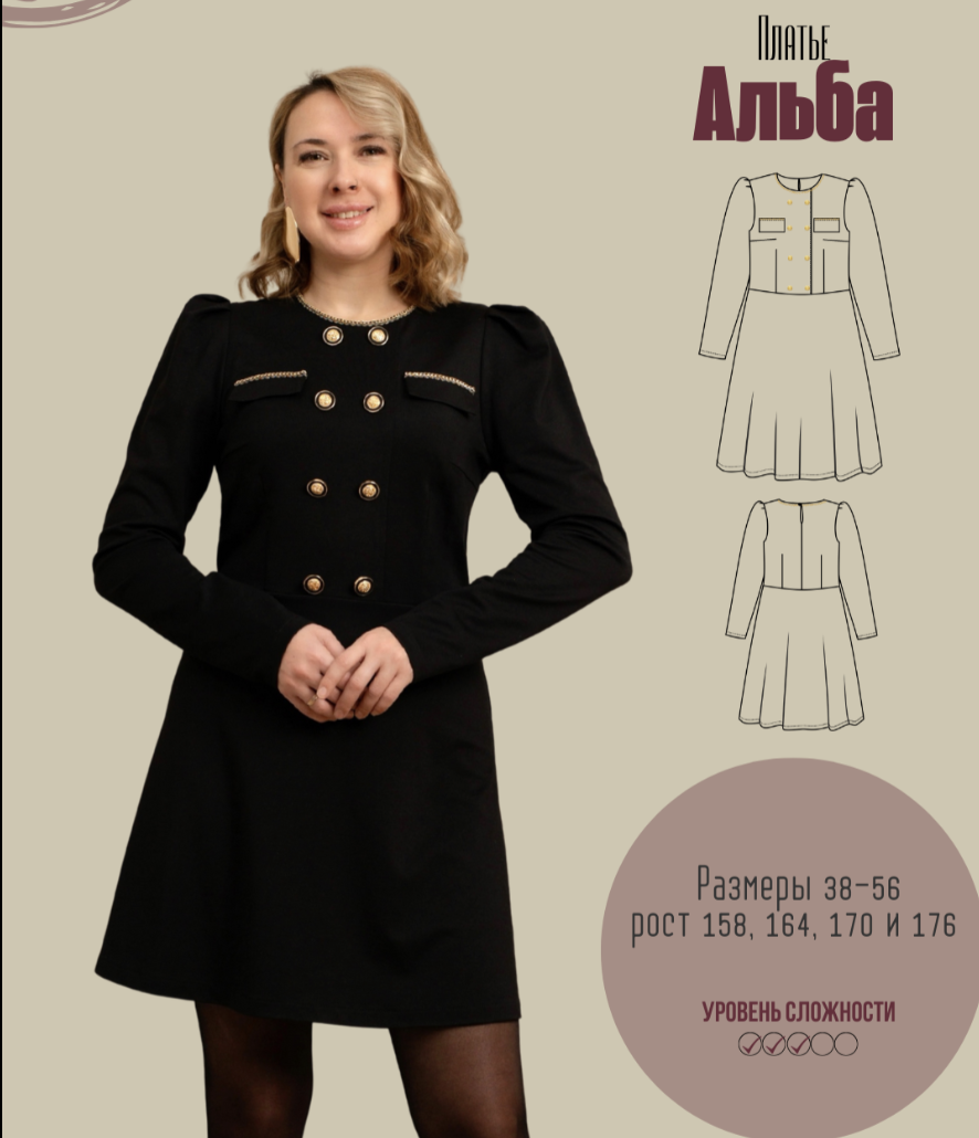 Женское трикотажное платье с лифом умеренного объема, прилегающего силуэта, отрезное по линии талии, юбка трапецивидного силуэта, по лифу переда имитация двубортной застежки, нагрудные и талиевые вытачки, а также нагрудные клапаны, по лифу спинки талиевые вытачки и центральный шов с вырезом у горловины и застежкой на пуговицу/петлю, длинный втачной рукав, по окату рукава заложены складки, длина платья выше колена, но с каждым размером увеличивается.