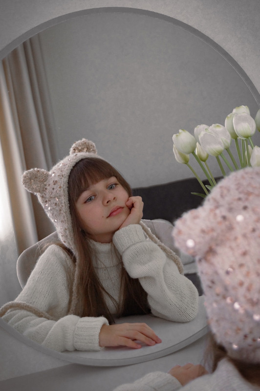 На ладони мастера ожил маленький мир тепла и заботы. Вязаный чепчик, словно крохотный островок любви, нежно окутал голову малыша пушистым облаком мягкости. Ушки мишки, вышитые с игривым озорством, трепещут от лёгкого ветерка детства, украшенные искрящимися капельками-звёздочками — блестящими пайетками, отражающими свет материнской улыбки. Ручная работа согревает сердце, храня тепло рук мастерицы, подарив малышу свою особую историю, неповторимую красоту и сказочную радость зимнего дня.