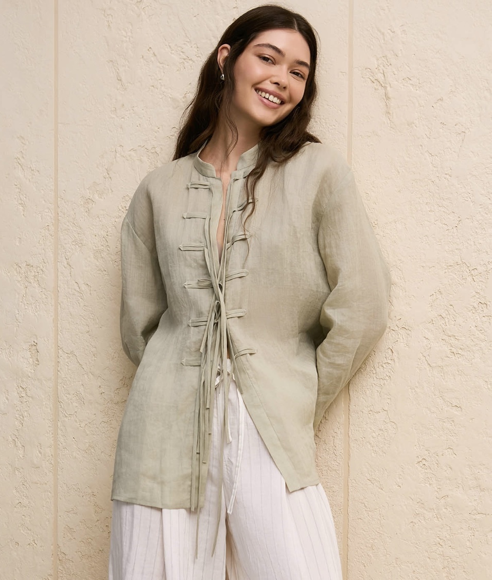 Рубашка большого объема, свободного силуэта, длиной ниже линии бедер, со спущенным плечом и воротником-стойкой.
