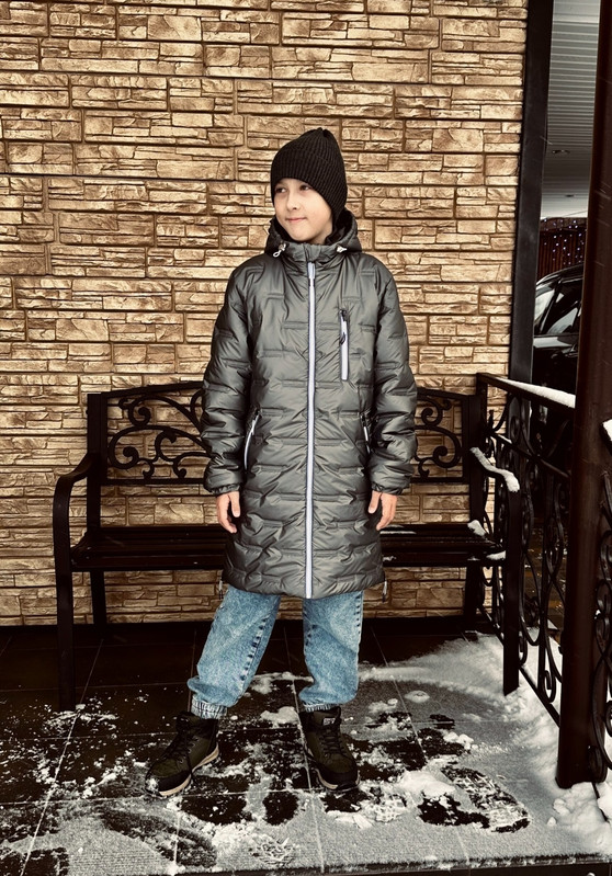 Модель Тимофей, куртка на рост 152-76, реальный рост (на момент фотосессии) 150 см, ОГ 74 см. Куртка сшита из готовой курточной стежки с утеплителем плотностью 150 гр, дополнительно на полочки и спинку добавлен утеплитель слайтекс найзс плотностью 100 гр, на подкладке поливискозная подкладочная ткань, подборт и все обтачки сделаны из курточной ткани дюспо.