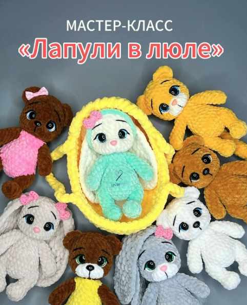 Одна универсальная схема, множество образов: зайки, мишки, котики, мини зайки Карамельки. Меняйте мордочки, придумывайте разные цветовые решения. Игрушки цельновязаные 14-15 см. (только ушки зайке и хвостик котику пришиваются — быстро и без заморочек). - 3 схемы мордочек (мишка, зайка и головушка с белой мордочкой, по которой можно связать и котика) - Однотонное тело + тело в боди/комбинезоне - Люлька из двух видов пряжи (уходит 100 г.) - 18 см. - Подушечка + одеялко для полного уюта - Новый крошечный бантик