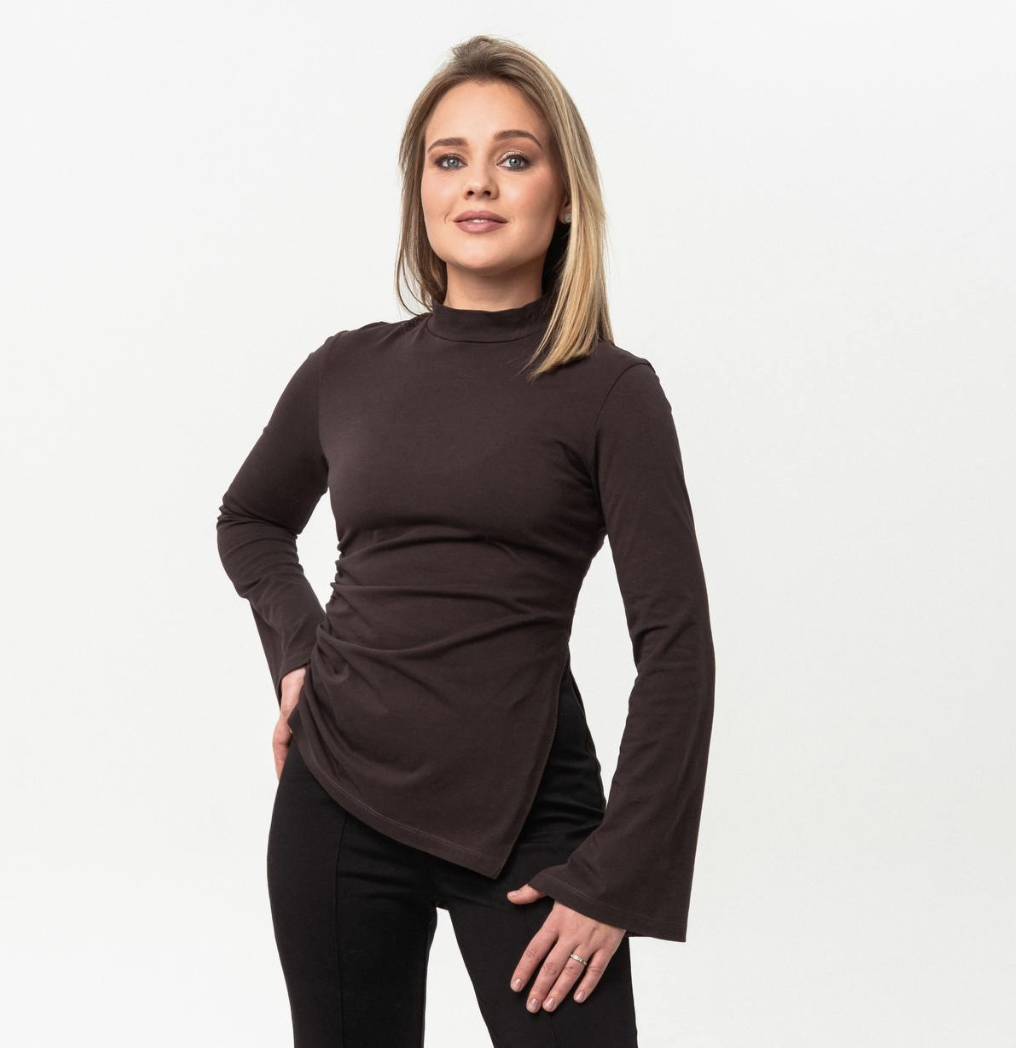 Лонгслив малого объёма, приталенного силуэта. С правой стороны в боковом шве оформлена сборка, в левом боковом шве выполнен разрез. Во-ротник-стойка. Рукав длинный, втачной, слегка расширенный книзу, по низу рукава выполнен разрез. Изделие и рукава по низу обработаны на плоскошовной машине (можно заменить швом двойной иглой).