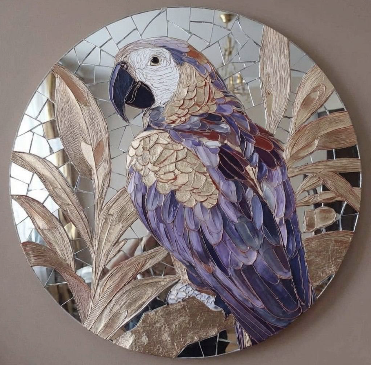 А также стильная интерьерная картина с объёмными зеркальными листьями, которые красиво спускаются сверху