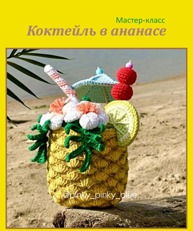 Мастер класс по вязанию крючком Тропического коктейля в ананасе. Размеры готовой игрушки из рекомендуемых материалов: диаметр 8 см, высота с декором около 16 см.