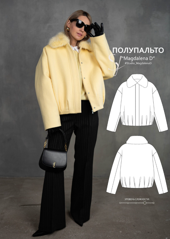 Выкройка полупальто прямого силуэта большого объема на утепленной притачной подкладке. Детали переда содержат прорезные карманы с втачной листочкой. Плечевая линия расширена. Рукав — длинный, двухшовный, рубашечного покроя. Воротник отложного типа на отрезной стойке. Центральная застежка выполнена на молнию и снабжена ветрозащитной планкой. В области низа изделия оформлены складки, а низ обработан обтачкой. Длина модели — выше линии бедер. Комплект дополнен съемным меховым воротником, который крепится к изделию на пуговицы.