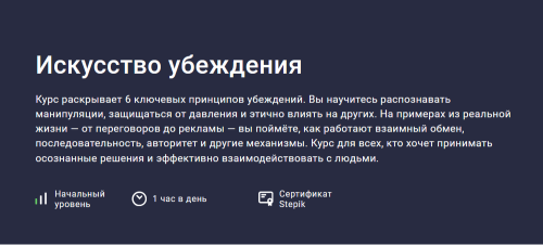 Курс раскрывает 6 ключевых принципов убеждений. Вы научитесь распознавать манипуляции, защищаться от давления и этично влиять на других. На примерах из реальной жизни — от переговоров до рекламы — вы поймёте, как работают взаимный обмен, последовательность, авторитет и другие механизмы. Курс для всех, кто хочет принимать осознанные решения и эффективно взаимодействовать с людьми.