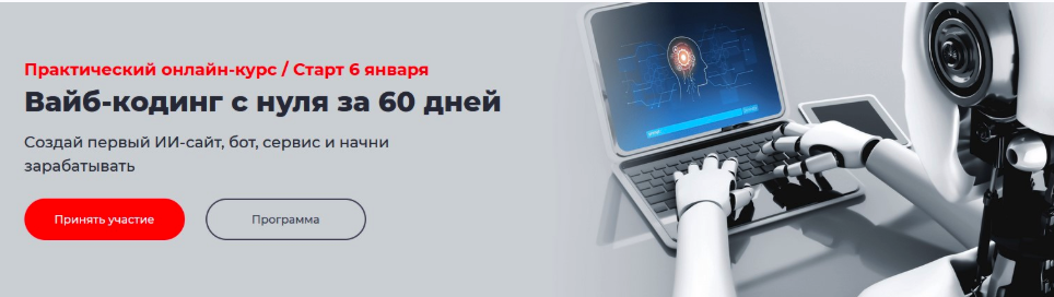 Практический онлайн-курс по вайб-кодингу для маркетологов, предпринимателей и экспертов, которые хотят самостоятельно запускать цифровые продукты с ИИ и не зависеть от разработчиков.
