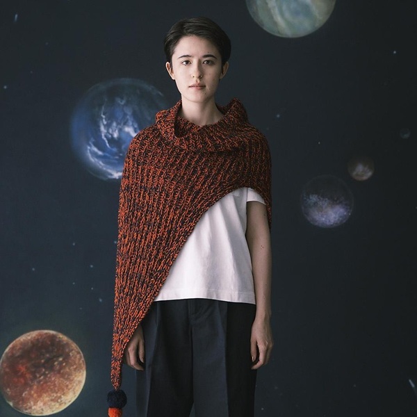 Снуд вяжется сверху вниз рыбацкой резинкой. Он вяжется по кругу для формирования основной детали снуда, затем разделяется на две части, которые вяжутся прямо для получения треугольных деталей переда и спины. Детали переда и спины формируются одинаково, поэтому вы можете носить снуд любой стороной. Для вязания используются обе нити, сложенные вместе, что позволяет получить меланжевый эффект.