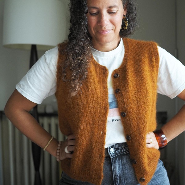 Универсальный дизайн, который позволяет связать одно из двух изделий на выбор: лаконичный жилет без застёжки или кардиган без рукавов с пуговицами. Он вяжется без швов сверху вниз.