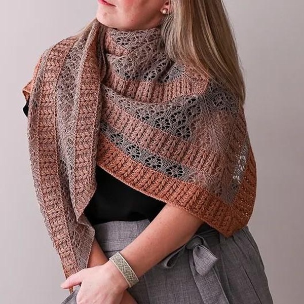 Дизайн Ausma подчеркивает легкость и универсальность пряжи lace weight и контраст между текстурами, создаваемыми участками, связанными в одну и в две нити. Он также предлагает плавный цветовой переход за счет использования основной (ОЦ) и контрастной (КЦ) пряжи, сложенной вместе, что создает смешанный оттенок в основном полотне.