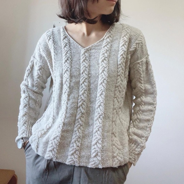 [Вяжи.ру] Вязаный спицами пуловер с V-горловиной и красивыми косами Morrie [Tomomi Yoshimoto]