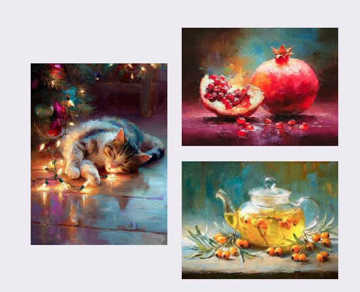 На бонусном занятии мы напишем самый уютный и трогательный сюжет – спящего кота под новогодней елкой, окутанного разноцветным сиянием праздничной гирлянды. Создадим волшебную картину, где теплые огоньки играют на пушистой шерстке, создавая причудливые цветные рефлексы – от золотистых и розовых до голубых и фиолетовых. Напишем момент абсолютного покоя и домашнего счастья, когда питомец сладко спит в атмосфере праздничного волшебства.